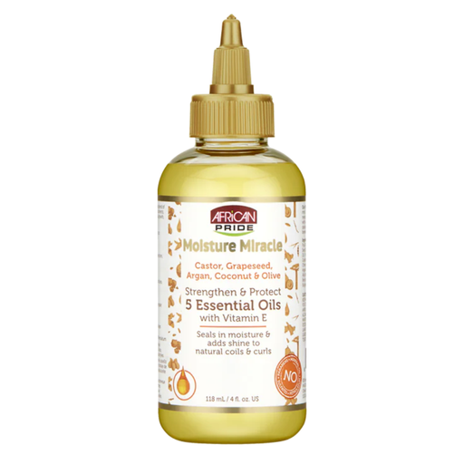 Descubre el poder restaurador del aceite para el cabello African Pride Moisture Miracle 5 Essential Oil, una fórmula equilibrada enriquecida con vi...